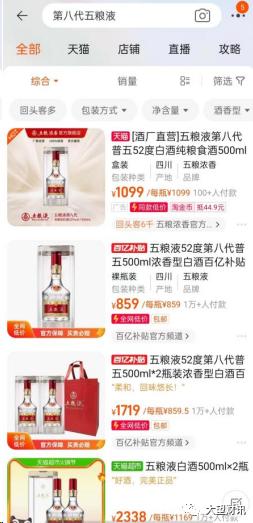 在11月22日,大望财讯在淘宝、京东、拼多多平台搜索第八代五粮液,其售价均与1499元/瓶有明显差距。具体看,在淘宝百亿补贴官方频道,第八代五粮液52度500ml单价约859元/瓶,与其零售价相比近乎“腰斩”。
