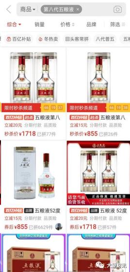在五粮液京东自营旗舰店、五粮液天猫浓香官方旗舰店中,该产品折后价分别为1039元、1099元,而在拼多多平台,第八代普五52度500ml单价甚至达到855元。