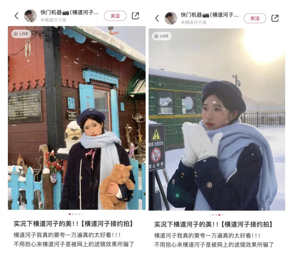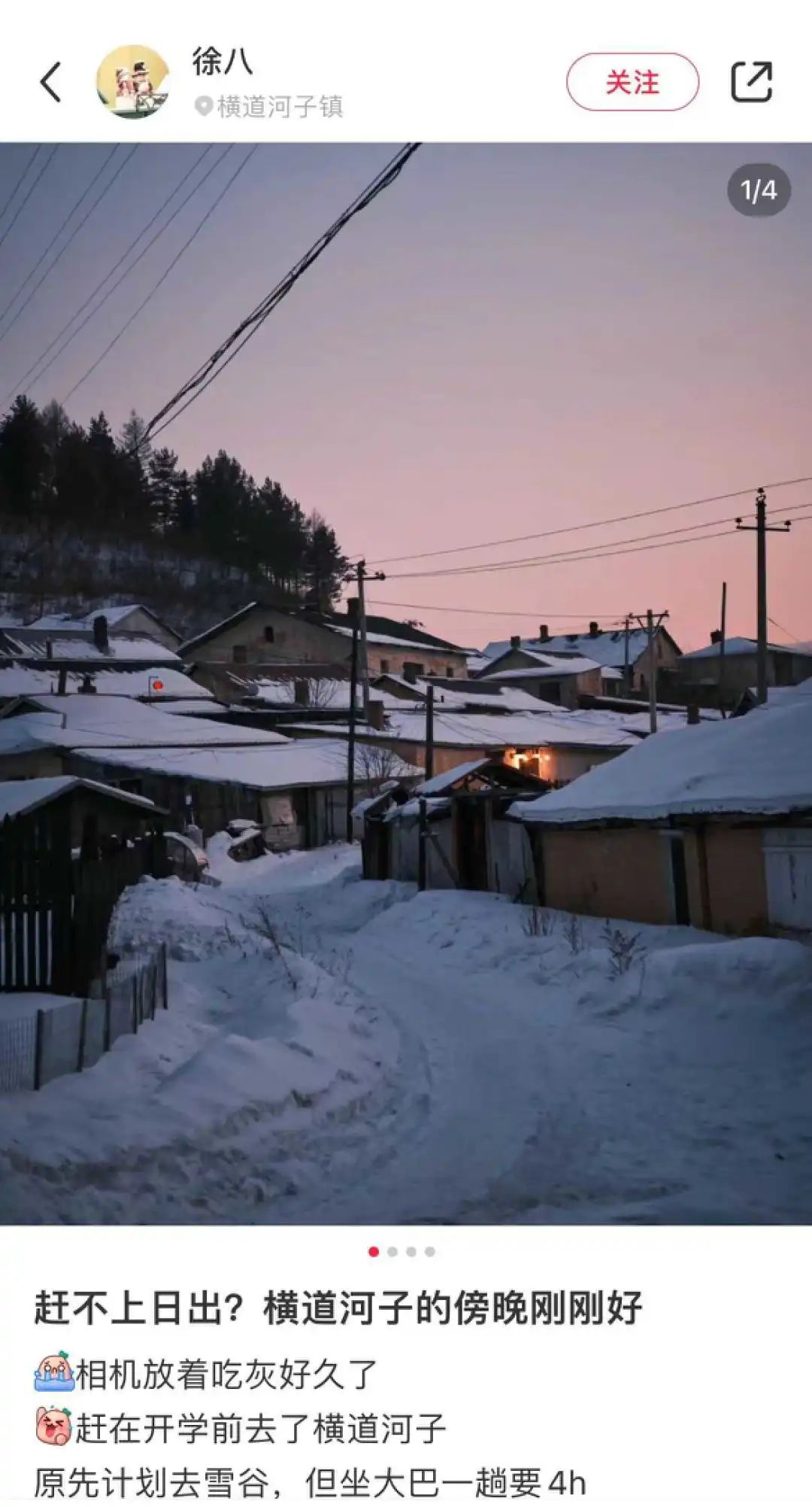 但大部分为了去拍照的游客都会选择小红书约拍,毕竟对比海马体一张就要399元的冬日恋歌风照片来说,两三百就能在横道河子拿下一条朋友圈九图。甚至还会收获拿来做头像两三年都舍不得换的【人生照片】。
