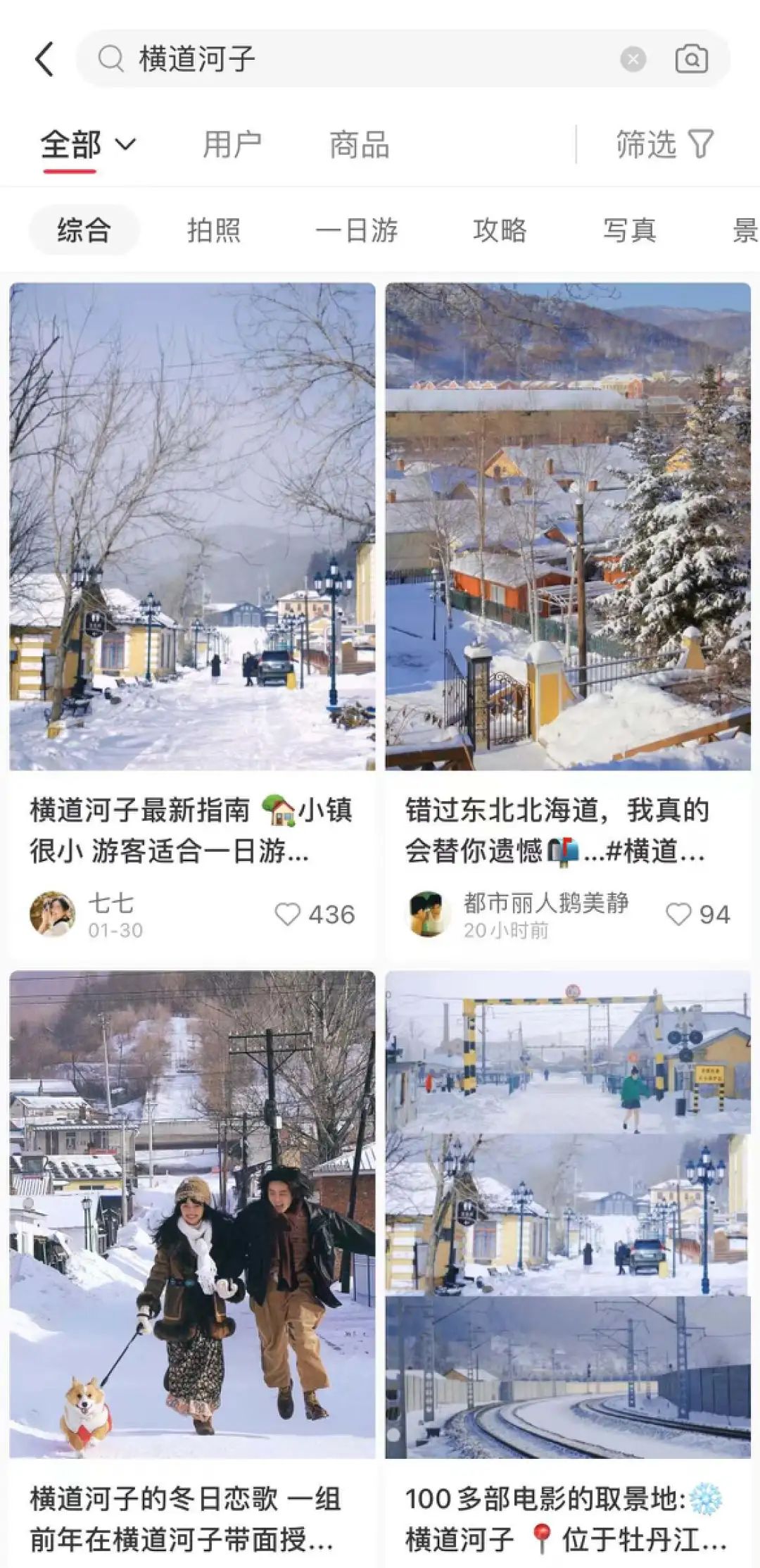 从横道河子下第一场雪开始,几乎所有约拍摄影师名字后面都带上了【接横道河子约拍】后缀。小红书搜“冬日照片”关键词,更是随处可见满屏的雪,模特们或穿着学院风大衣手捧书本,或戴着毛茸茸可爱耳罩,在厚厚的雪地里朝摄影机投来毕生最清澈的目光。