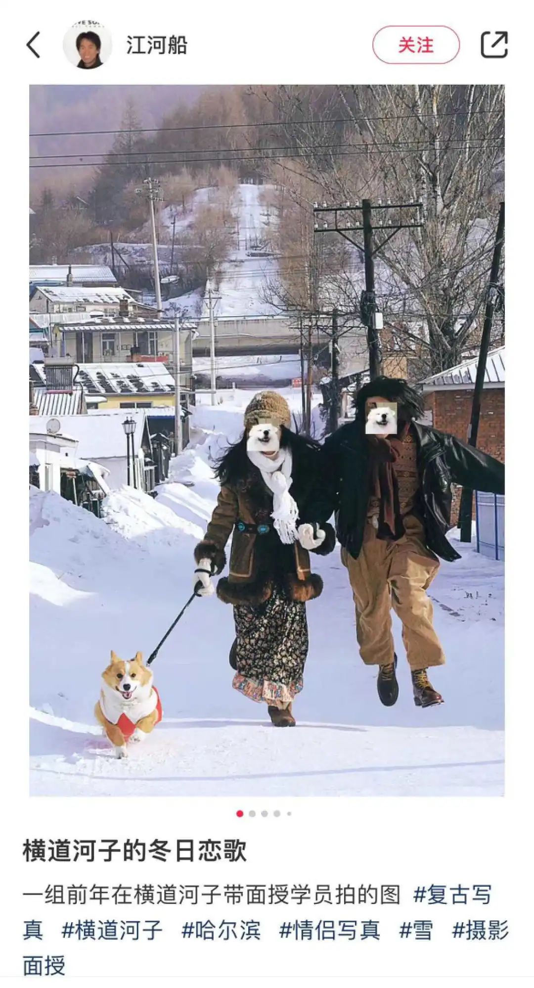 最初让横道河子火了一把的出圈照片,是小红书博主@江河船拍的冬日情侣照。有年代感的皮衣皮靴、碎花裙毛领袄,配上背景里矮矮的平房,狂奔的柯基,嘴里呼出的冷气都夹着甜味。