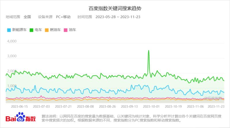 根据百度指数关键词搜索趋势对比数据来看,新能源车、电车词条的相关线上流量热度,远超燃油车、油车词条。当然,这些都映衬了燃油车的“沉默”。
