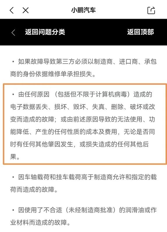 比如小鹏的电池终身质保规则里有这么一条,“由任何原因(包括但不限于计算机病毒)造成的电子数据丢失、损坏、毁坏、失真、删除、破坏或改变而造成的故障”。