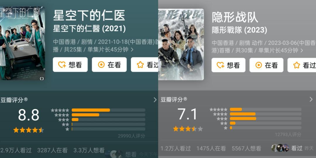 马国明则是经历多年陪跑之后在2020年终于凭借《白色强人》拿到了“最佳男主角”奖。细数他近年的代表作,《白色强人》豆瓣8.2分,《星空下的仁医》豆瓣高达8.8分,分别有3.3万人和2.9万人评分。而今年马国明的两部剧《隐形战队》《法言人》则分别是7.1分和6.8分,观众目前对于TVB医疗剧的认可明显高于警匪剧和律政剧,可见港剧早已不适合“一招鲜,吃遍天”,挖掘更合适当下的题材、凸显剧集制作的优势才是正道。