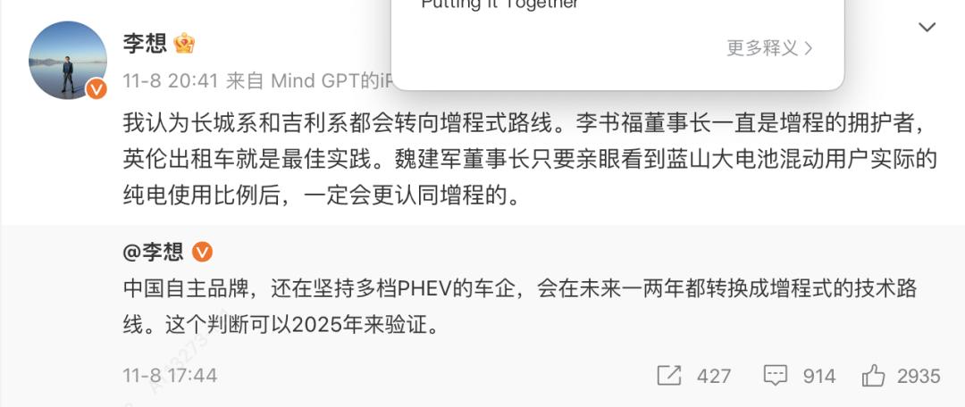 “中国自主品牌,还在坚持多档PHEV的车企,会在未来一两年都转换成增程式的技术路线。这个判断可以2025年来验证。”2023广州车展前夕,理想汽车CEO李想又成功制造了一个话题。
