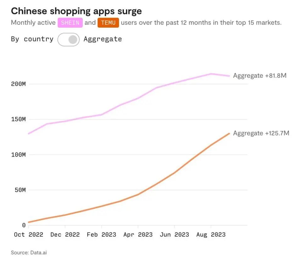 市场研究公司Data.ai的数据显示,到2023年9月,也就是推出大约一年后,Temu在美国的月活跃用户已超过6100万。它现在在全球48个国家和地区上线。Shein是世界上最大的快时尚公司之一,并已扩展到销售其他产品,如家居用品和电子产品。Shein在115个国家的谷歌应用店中始终是排名第一的购物应用。与此同时,TikTok Shop在东南亚迅速发展,并于今年9月在美国推出。