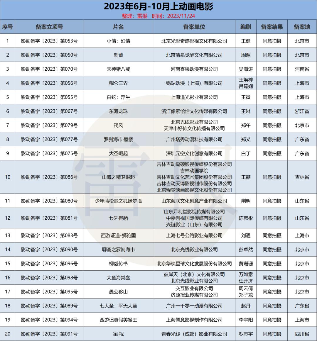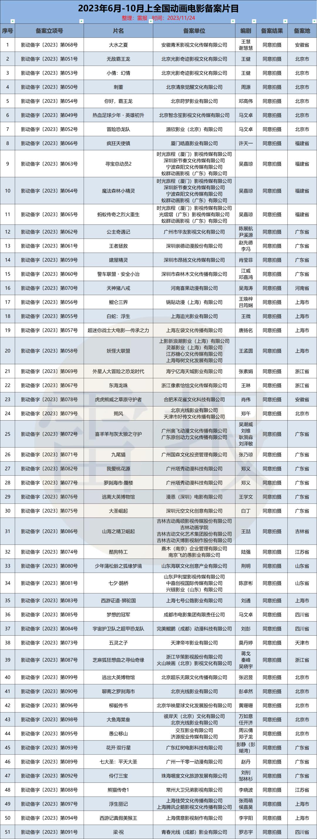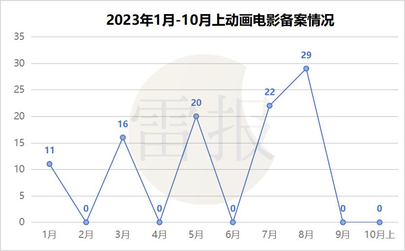 近日,国家电影局发布了“关于2023年10月上全国电影剧本(梗概)备案、立项公示的通知”。通过进一步整理和统计,雷报获悉:2023年6月至10月上(10月下暂未公布),共有51部动画电影通过备案,且备案时间全部集中在暑期,其中7月共22部,8月共29部;6月、9月以及10月上均没有动画电影备案。