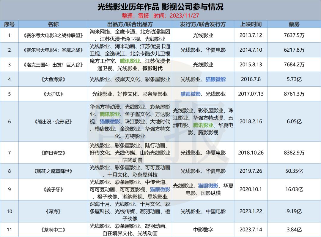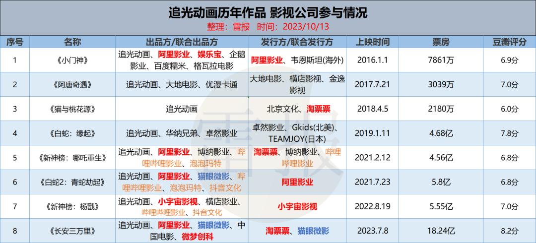 雷报曾盘点过“追光动画”的十年之路,可以看出阿里系(表格红字)是追光动画最紧密的金主。