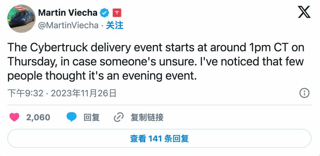 特斯拉一位高管表示,该公司将于美国中部时间11月30日(周四)下午1点(在德克萨斯州的超级工厂举行备受期待的Cybertruck交付活动。