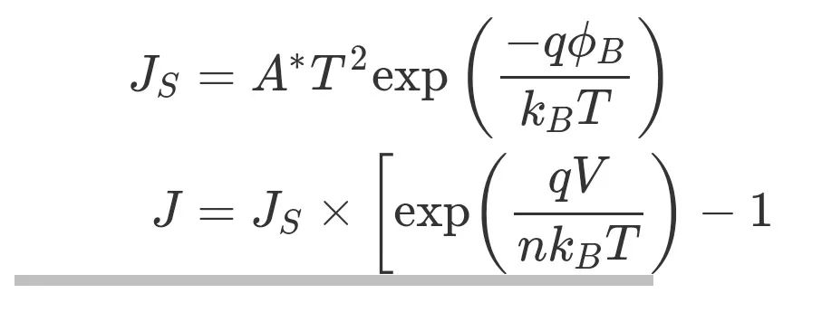 如图所示,JS ,A* ,T ,n ,q ,φb , 和kB是反向饱和电流密度,理查森常数(90 A cm−2 K² 对于金刚石),分别是绝对温度、理想因子、基本电荷、SBH 和玻尔兹曼常数。带和不带场板的 SBD 提取的理想因子分别为 4.77 和 3.71。根据四个制造的 SBD 的配件估算的 SBH 为 1.02 ± 0.01 eV。SBH 与先前报道的横向器件中的其他钼金刚石肖特基接触非常一致。