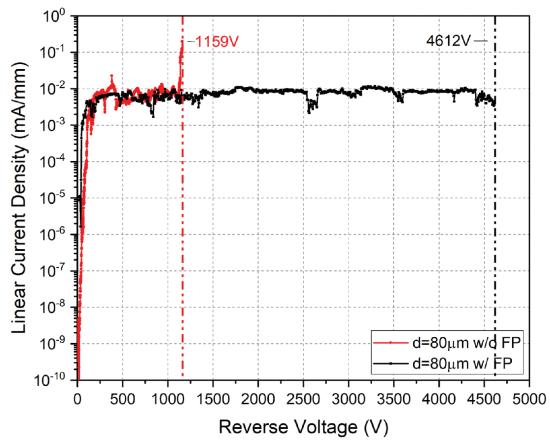 图 3:带和不带 FP 的金刚石横向 SBD 的室温反向漏电J -V 特性。