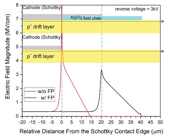 图 4:沿着虚线切割线的模拟水平电场强度0.1微米_远离金刚石-肖特基接触界面,用于在 3 kV 反向偏压下带或不带 FP 的横向 SBD。