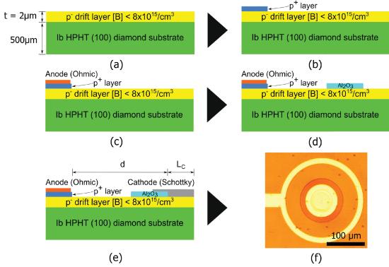 图1:金刚石横向 SBD 的外延和洁净室微加工步骤 (a)p-漂移层外延生长;(b)p+ 接触层选择性生长;(c)欧姆接触沉积;(d)Al2O3场板形成;(e) 肖特基接触沉积;(f) 使用视场板制造的金刚石横向 SBD 的俯视显微镜图像。