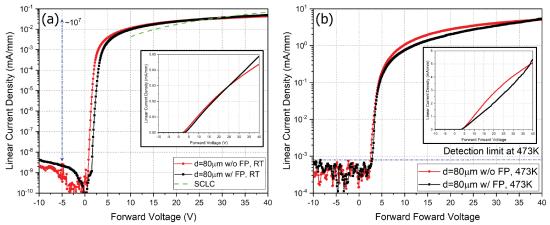 图 2:(a)室温 (RT) 下,带和不带场板 (FP) 的金刚石横向 SBD 的正向J -V 特性,以半对数和(插图)线性标度表示;虚线表示计算出的空间电荷限制传导 (SCLC) J -V 关系。(b) 200 °C 时,带和不带 FP 的金刚石横向 SBD 的正向J -V 特性,采用半对数和(插图)线性标度。