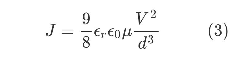 图 2(a)还绘制了在所制造的二极管中计算出的 10 – 40V 正向电压下的空间电荷限制传导 (SCLC) 电流密度。由于掺杂剂在室温下不完全电离,漂移区中的活性空穴浓度估计低于1014cm-3。随着施加的正向偏压增加,随着注入电荷在漂移区累积,电荷中性不再保持,SCLC 开始占主导地位。对于轻掺杂半导体,SCLC 由 Mott-Gurney 关系描述: