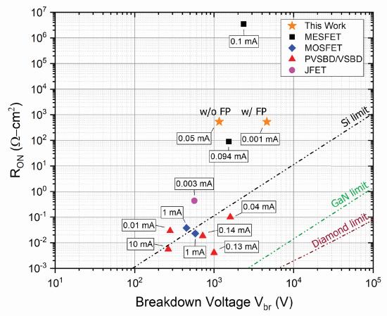 图 5:所制造的横向 SBD 与之前报道的金刚石功率器件(包括横向 MESFET、MOSFET 和Jet FET,以及室温下的伪垂直和垂直 SBD)进行比较的基准。括号中显示了报告击穿时的漏电流。