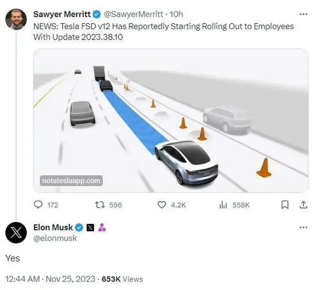 11月25日,媒体报道,特斯拉已开始向员工推出全自动驾驶(FSD)V12版本,更新版本号为 2023.38.10。很快,特斯拉CEO马斯克也在X上确认了这一消息。