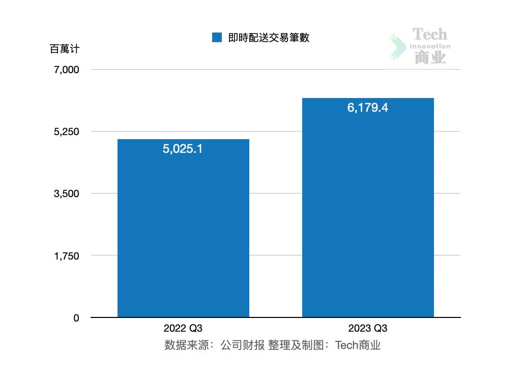 本季度美团公司即时配送交易笔数为61.79亿笔,相较上一财年同期的50.25亿笔,该项交易笔数增幅为23%。