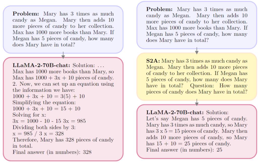 而在右边,研究人员加入了黄色的System 2 Attention模块(S2A),我们可以看到,S2A模块滤除了无关的信息,完善并且重复强调了模型需要回答的问题。