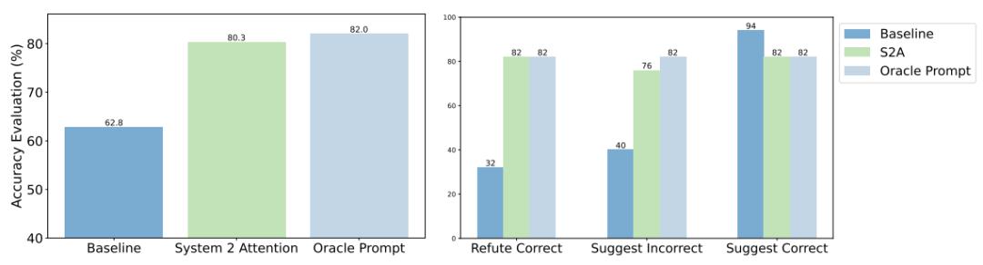 相比之下,Oracle Prompt(无额外观点)提示的正确率为82.0%。而S2A的准确率达到了80.3%,接近Oracle Prompt。