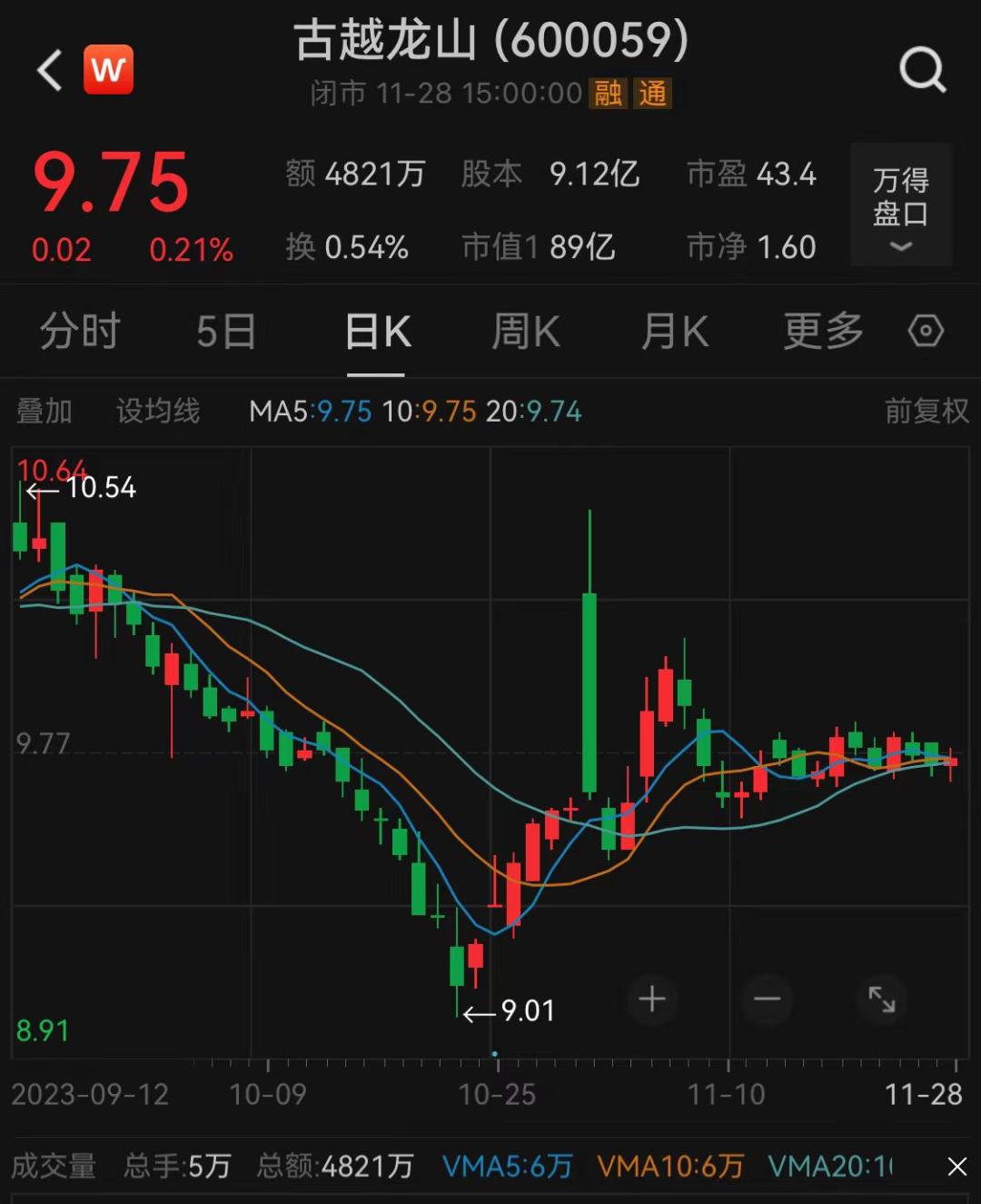11月28日收盘,古越龙山每股报9.75元,涨幅0.21%,最新市值为89亿元。