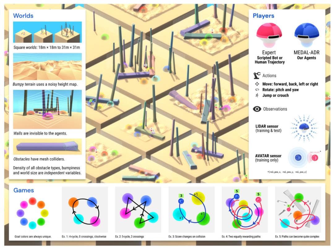 在每个任务中,AI 智能体需要按照特定的循环顺序访问目标球以获取奖励,而这个顺序是在任务开始时随机确定的。然而,AI 智能体并不知道正确的顺序,所以它必须通过实验或从专家那里学习来弄清楚。不过,这个任务空间设计得很复杂,可以通过调整世界的大小、障碍物的数量、地形的崎岖程度以及目标球的数量等参数来改变导航的难度。