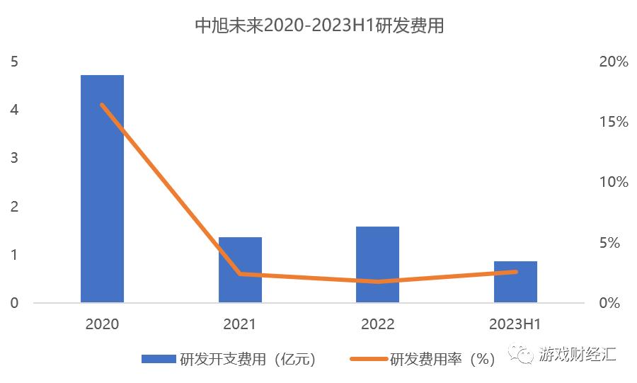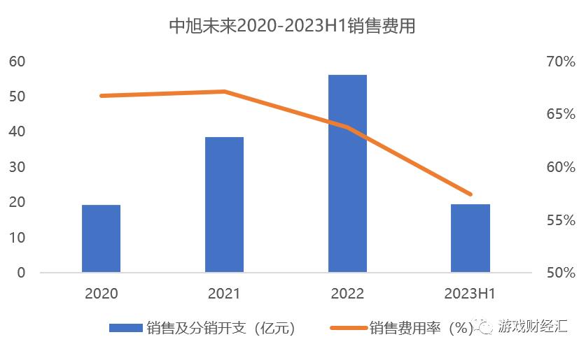 2020-2022年,中旭未来销售费用率均超过60%。2023年上半年,公司减少了营销行为,销售费用率有所下滑,但仍超过55%。目前中旭未来的销售费用率超过三七,是国内销售费用率最高的游戏股之一。