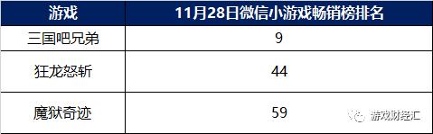 11月28日微信小游戏畅销榜排名显示,中旭未来有3款产品位居畅销榜TOP99,表现最好的是一款三国题材休闲割草游戏《三国吧兄弟》,主打割草快感,目前位居小游戏畅销榜第9位。传奇类游戏《狂龙怒斩》位列第44,魔幻游戏《魔狱奇迹》第59。