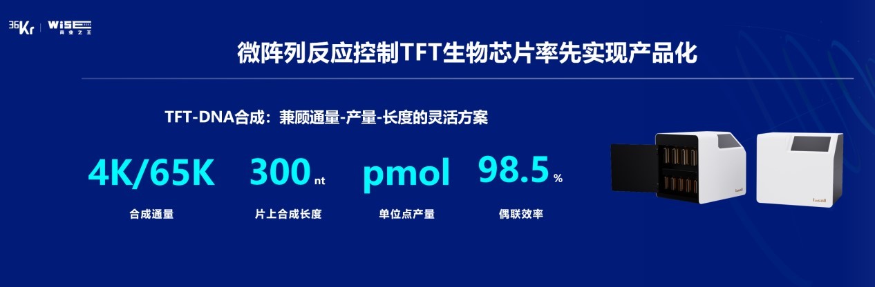 得益于团队的不懈努力,我们在今年已经推出了基于TFT半导体生物芯片完成高通量DNA合成的桌面式TFT-DNA合成仪,右边是我们的产品图。大家可以看到,围绕着高通量合成,目前我们已经将通量长度,产量以及它的偶联效率都提升到了目前业内比较好的水平。