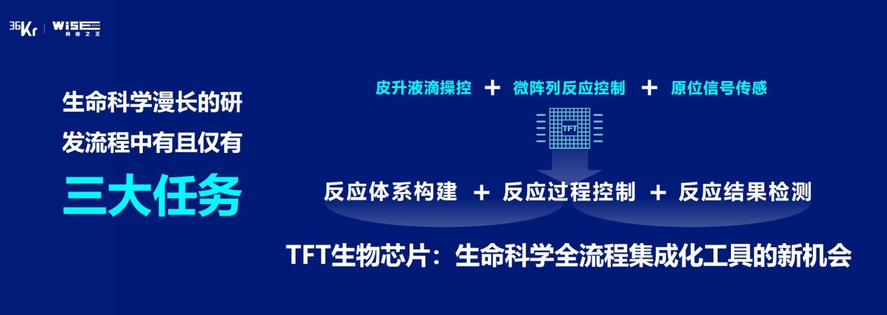 TFT本身作为一种高通量、大面积、低成本的半导体,我们利用它的皮升液滴操控、微阵列反应控制、原位信号传感等功能,可以通过一块TFT芯片或者一种底层半导体技术来实现反应体系的构建、反应过程的控制以及反应结果的检测的三大任务,一步步的提升各个环节的效率。用中国制造的半导体技术,去攻克全球在生命科学全流程集成化工具的难题,从而提升生命科学的效率。