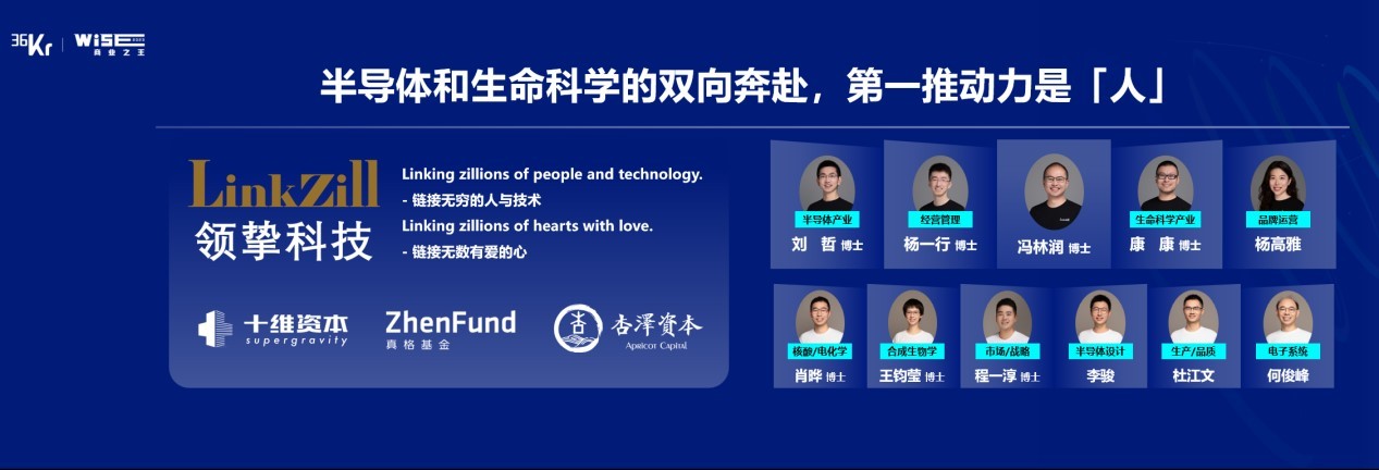 我是上海交大的博士,2015年去了英国剑桥,并在英国工作了几年,博士毕业之后,选择回国创业。刘哲是领挚科技的CTO,他之前一直在华星光电做 TFT半导体。杨一行是我们的联席CEO,之前是TCL的高管,也曾经是我最大的客户。他们两位都是半导体的博士,而康康是领挚科技的第一个生命科学博士,也是华大基因最早期的员工,在合成生物学这个领域做了很多探索,来到领挚科技以后对公司的生命科学管线进行了定义,以及规划未来的一些产品。还有杨高雅来自我们上两轮的投资方真格基金,程一淳同样来自我们的投资方杏泽资本。这一路走来,我们把大家从世界各地慢慢的汇聚在杭州,团队也从只有3个人变成50个人的规模,现在有7个博士,其中3个半导体博士,4个生命科学和化学博士。