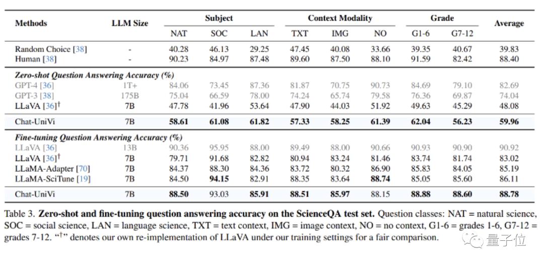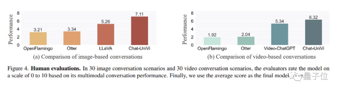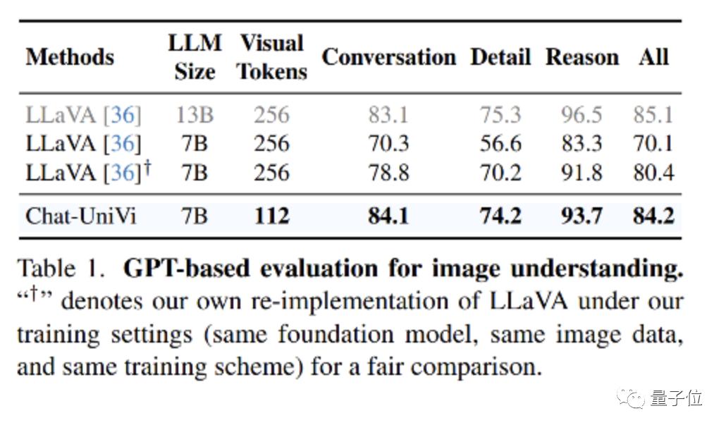 7B参数的Chat-UniVi模型能达到13B大小LLaVA模型的性能水平。这证明了该方法的有效性。