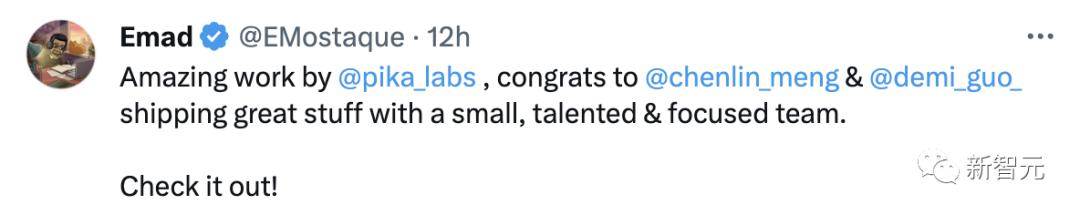 Stability AI的首席执行官对Pika Labs的最新成果也是赞不绝口。