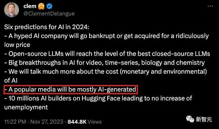 作为Pika Labs的天使投资人,Hugging Face CEO Clement昨天也做出了预言:
