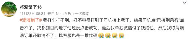 有网友表示:“我打车打不到,好不容易打到了司机接上我了,结果司机点’已接到乘客‘点击不了,我都到目的地了他还没点击成功,最后我单独微信付了钱给他,然后我取消滴滴订单还取消不了,找客服也是一堆代码。”