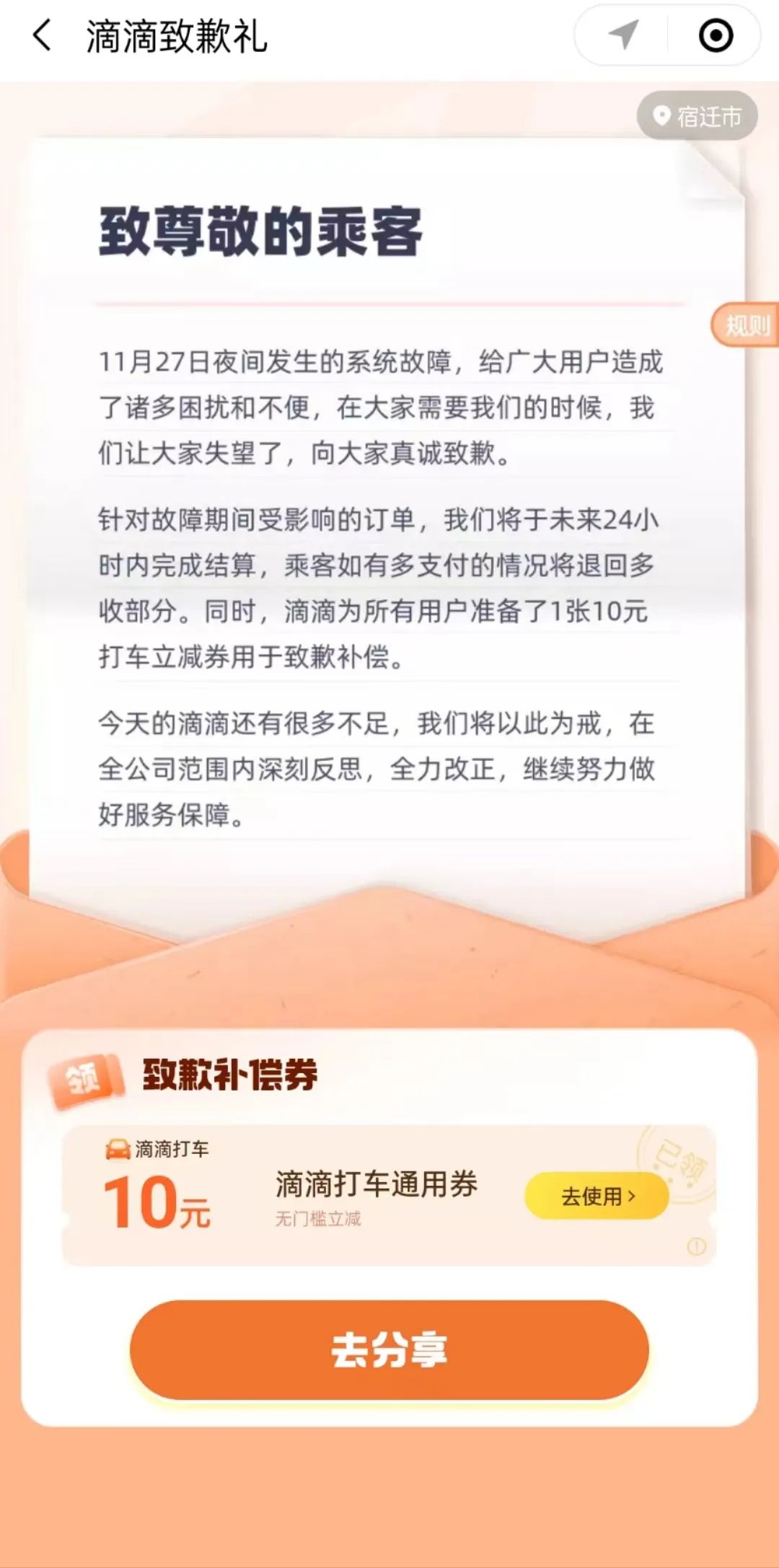 最后对于此次事件带来的广泛影响,截至目前,滴滴也非常有诚意地为所有用户准备了 1 张 10 元打车立减券用于致歉补偿,话说,你领到了吗?