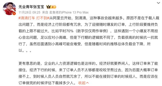 有微博用户评论道,「这种事故会越来越多...原因不是在于裁人裁出问题了,而是经济上行阶段都有冗余,为了迎接随时爆发的订单,上行阶段要维持负载的上限不能过大,比如平时 70%(数字仅仅用作举例),这样遇到一个小爆发不用担心会出问题,足以应对小高峰,但是下行期的逻辑就不同了,负载很高的时候抗一抗就行了,虽然后面遇到小高峰可能会难受,但是随着时间的推移总体负载会下降,所以。。。」