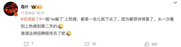 紧接着,#滴滴崩了#、因迟到而导致的 #全勤奖没了#等相关词条相继出现在热搜榜单,一时之间,各种口诛笔伐,滴滴成为众矢之的。