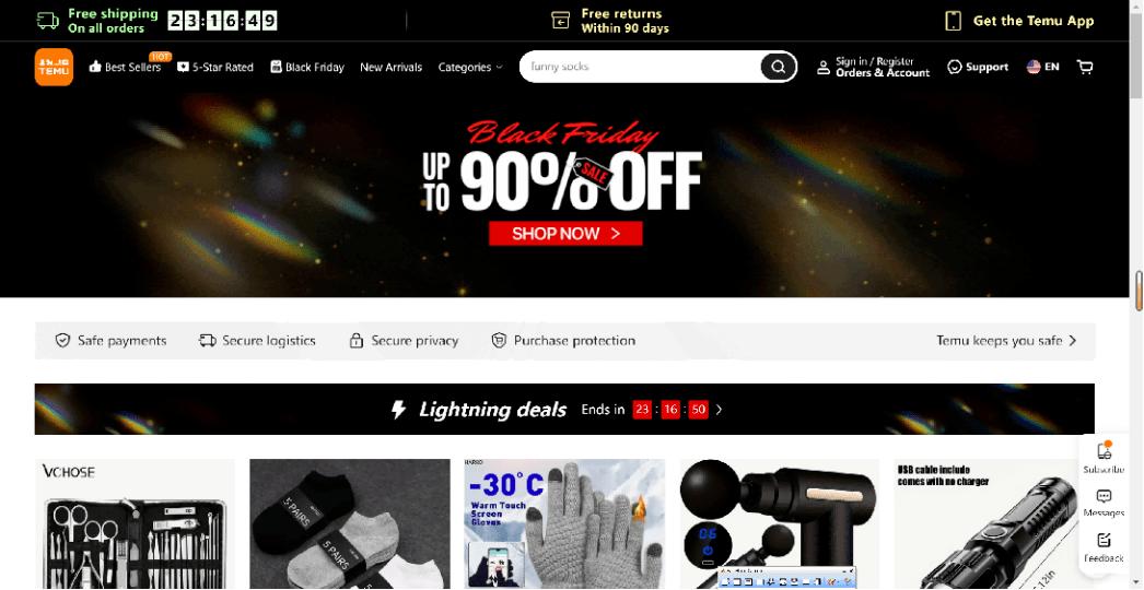 Temu的黑五促销首页“最高90% OFF”折扣