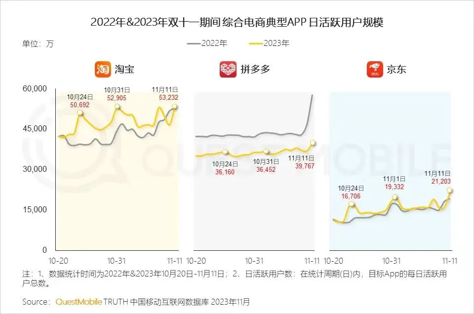 根据QuestMobile发布数据显示,淘宝和京东活动期间的日活人数明显多于去年双十一,而拼多多的日活人数始终不温不火,也低于去年同期,虽然在11月11日也达到了近期高点,但并不像去年那样“一飞冲天”。