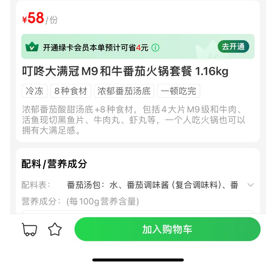 壹览商业浏览叮咚买菜app发现,有诸多产品已搭配好荤素,详情页会标注“一顿吃完”“一个人吃火锅”等字眼。