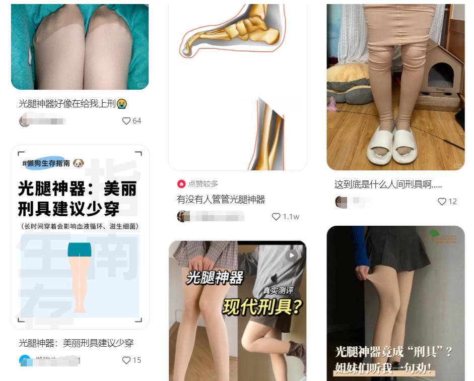 但现实是“光腿神器堪称现代刑具”这一话题走红了。在小红书中,一位女生发帖称“古有缠足鞋,今有光腿神器,穿了还没有一个下午,脚疼的受不了,回家脱了感觉大拇指都不会使劲了。”