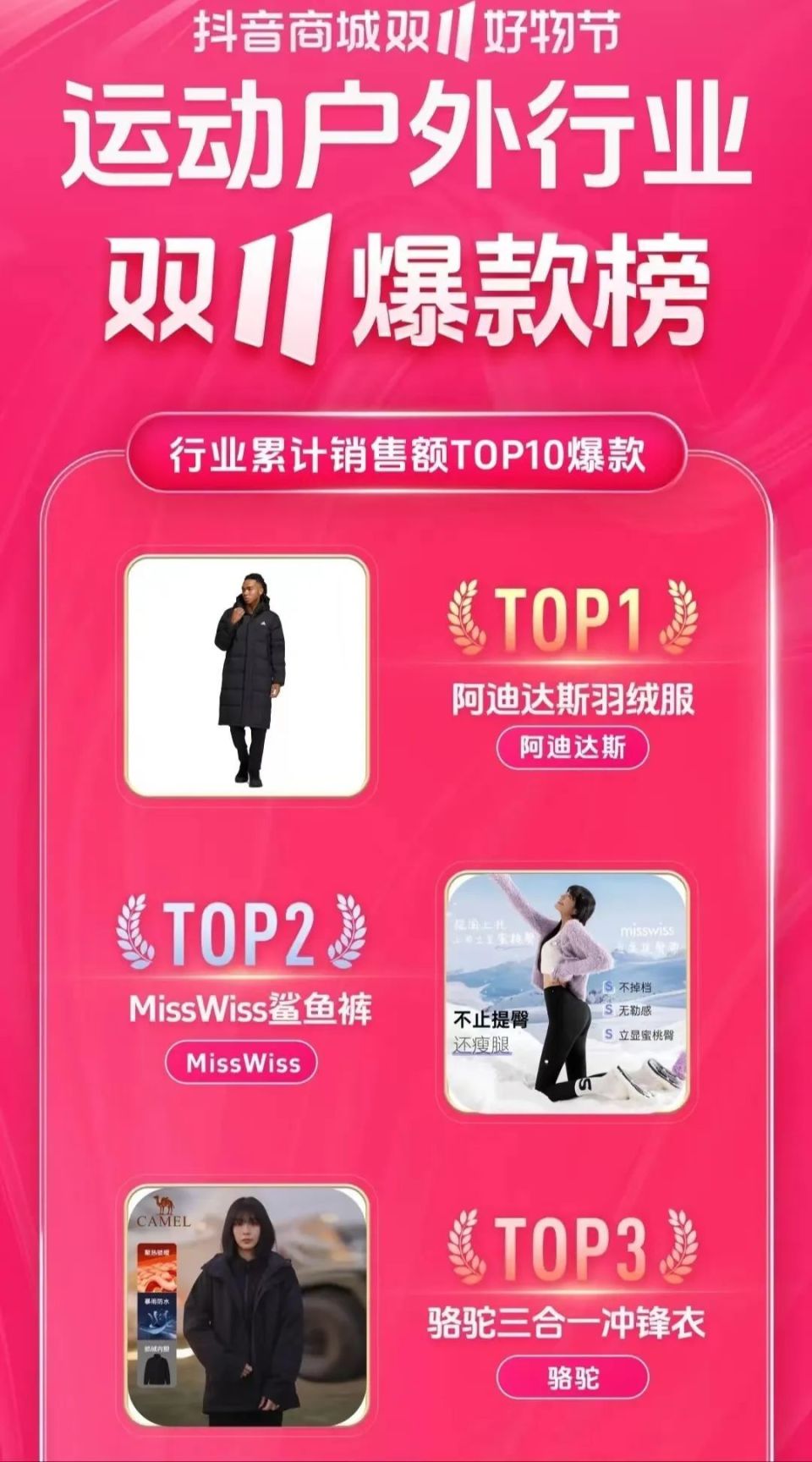 另一个“赢家”MissWiss在抖音也颇有收获,在抖音运动户外行业双11爆款榜中,MissWiss鲨鱼裤销量已经居于第二,超过了骆驼的冲锋衣,仅次于阿迪达斯的羽绒服。