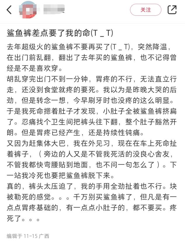 被品牌宣传“显瘦”的鲨鱼裤,很多消费者心动买回去试了,也觉得不是那么回事。“穿上身花了两分钟,不仅不显瘦,还勒肚子、掉档”,甚至有消费者反应“小肚子被鲨鱼裤挤扁了,导致胃部钝痛,想要脱下来用尽全力扯不下来,劝大家千万别买鲨鱼裤”。