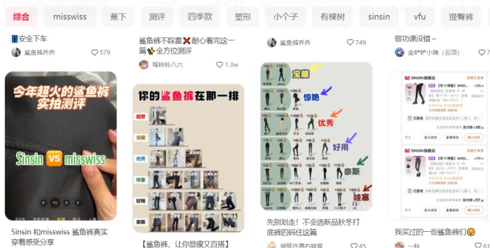 在小红书搜索“鲨鱼裤”,随处可见SINSIN、MissWiss,ubras、有棵树,VFU、暴走的萝莉、蕉下等一众品牌鲨鱼裤的测评帖。仿佛一时间,做内衣的品牌,做瑜伽服的品牌,做防晒衣的品牌,全都杀入了鲨鱼裤这个细分赛道,想趁着这款单品走红赚上一桶金。