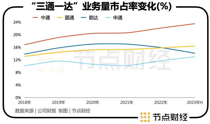 2019年在潘水苗接盘圆通CEO一职时,圆通的市场份额连续落后韵达两年,甚至2020年-2021年双方的市占率差距接近2个百分点,但经过潘水苗的一番努力,目前这一局面已被翻转。