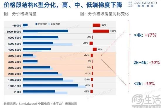 事实上,调研机构Sandalwood此前发布的中国电商市场监测数据也能够说明这一问题,据其所公布的数据显示,4000元以上价位段机型在2023年上半年的销量同比增长17%、市场份额达40%,2000-4000元产品的份额则降低至24%。