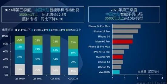 调研机构Canalys此前公布相关数据显示,2023年第三季度高端智能手机(售价3500元以上)的出货量占比已达33%,同时中高端机型(售价2500-3499元)的出货量占比也达到了19%。