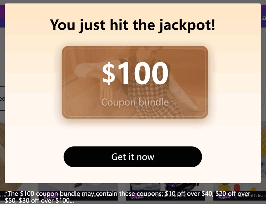 黑五大促期间登录Temu,映入眼帘的是巨大且显眼的“90%OFF”以及秒杀活动入口。根据Temu的促销规则,除了最高有90%的折扣外,平台还会送给消费者200美元优惠券,0.1美元即可包邮,14天未收到货免单,90天不满意全额退等超高力度的优惠活动。刺猬公社只是随手在Temu上参加了抽奖大转盘,就获得了100美元的购物优惠券。
