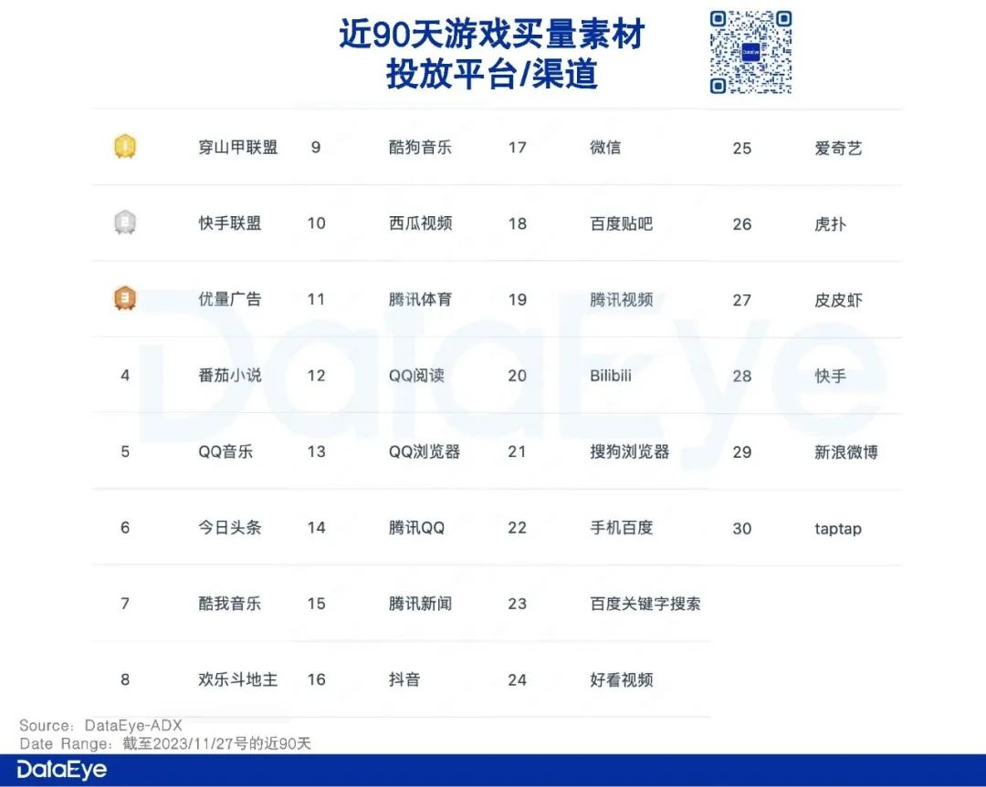买量呢?ADX数据显示:截至11月27号的近90天,游戏买量素材主要投放的平台中,微博仅位列29位。